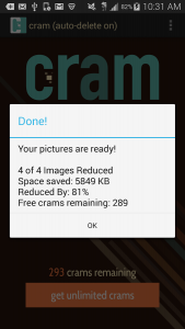If you use Cram to compress pictures, the images you send will be a smaller size and help you stay within your monthly allowance for data. Depending on your plan, you may even save on overage fees if you happen to send more data than allowed.